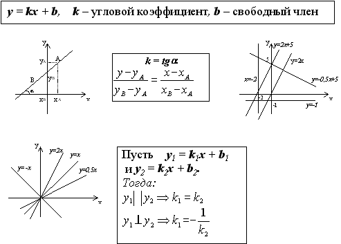 Графиком линейной функции y = kx является прямая, проходящая через начало координат. Коэффициент k называется угловым коэффициентом этой прямой. Он равен тангенсу угла наклона этой прямой к оси X: k = tg
