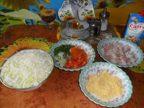 Капуста, мясной фарш, отварной рис, зеленый перец, петрушка, томатный соус.