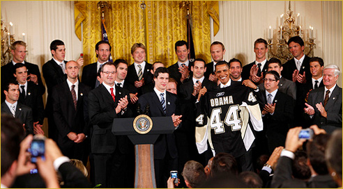 Хоккеисты «Питтсбург Пингвинз» стали почетными гостями в Белом доме. Там они встретились с президентом США Бараком Обамой. В своей приветственной речи президент поздравил команду с завоеванием Кубка Стэнли, а также отметил благотворительную деятельность клуба.