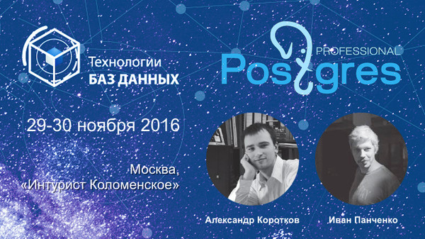 29 и 30 ноября 2016 года в Москве состоится конференция «Технологии Баз Данных». Конференция проводится издательством "Открытые системы" и Агентством корпоративных коммуникаций OSP-Con. По заявлению организаторов, основной темой конференции станет обзор реальных (а не декларируемых) возможностей современных баз данных и инструментов работы с ними. Компанию Postgres Professional на конференции представят Иван Панченко и Александр Коротков двумя очень важными докладами.