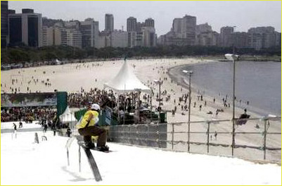 Бразильские спортсмены с удовольствием пользуются возможностью прокатиться на своих досках, не выезжая за границу, а жители и гости Рио могут по достоинству оценить трюки сноубордистов, продолжая лежать на теплом песочке. :-)